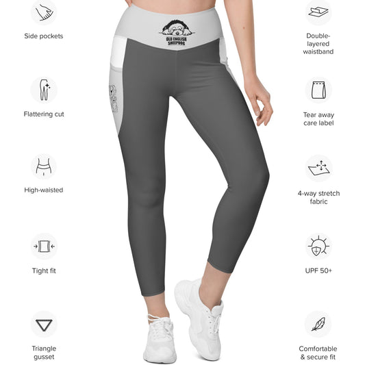 Old English Sheepdog Leggings with pockets, Old English Sheepdog Grey and White Leggings