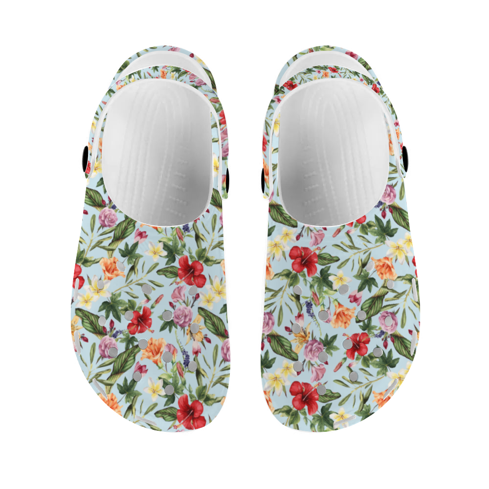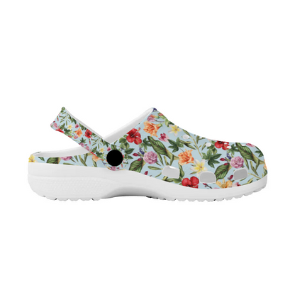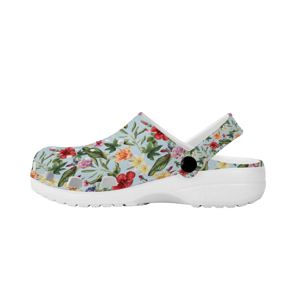 These clogs for mom or mum, slip on's for women, or floral shoes for a gardener, no matter who or what name tag you give them, these flowered clogs are for anyone who is likes unique, and very comfortable shoes. And these turquoise blues, deep blues and light blue flowers with the beautiful accents of gold are those shoes.