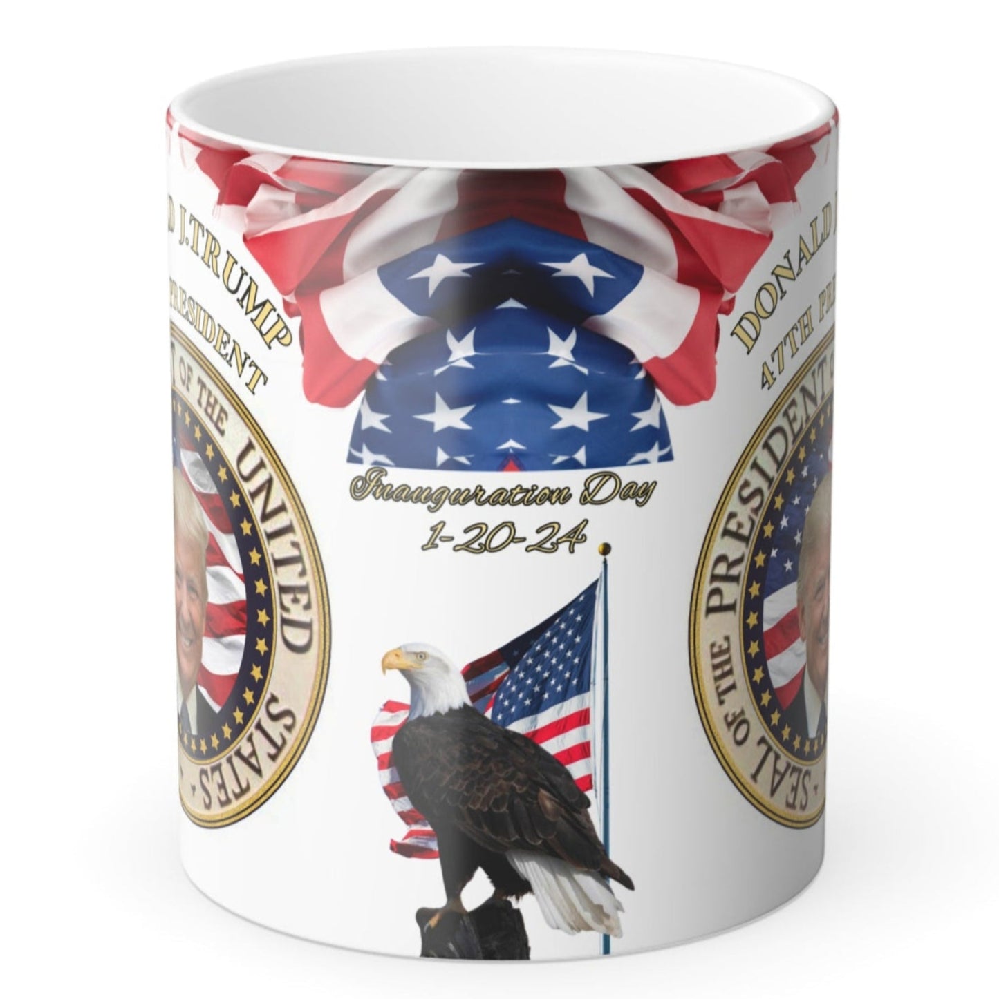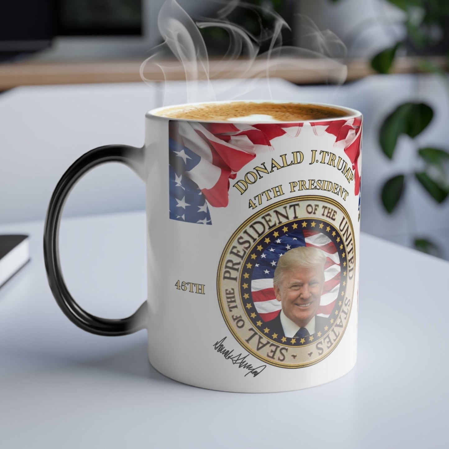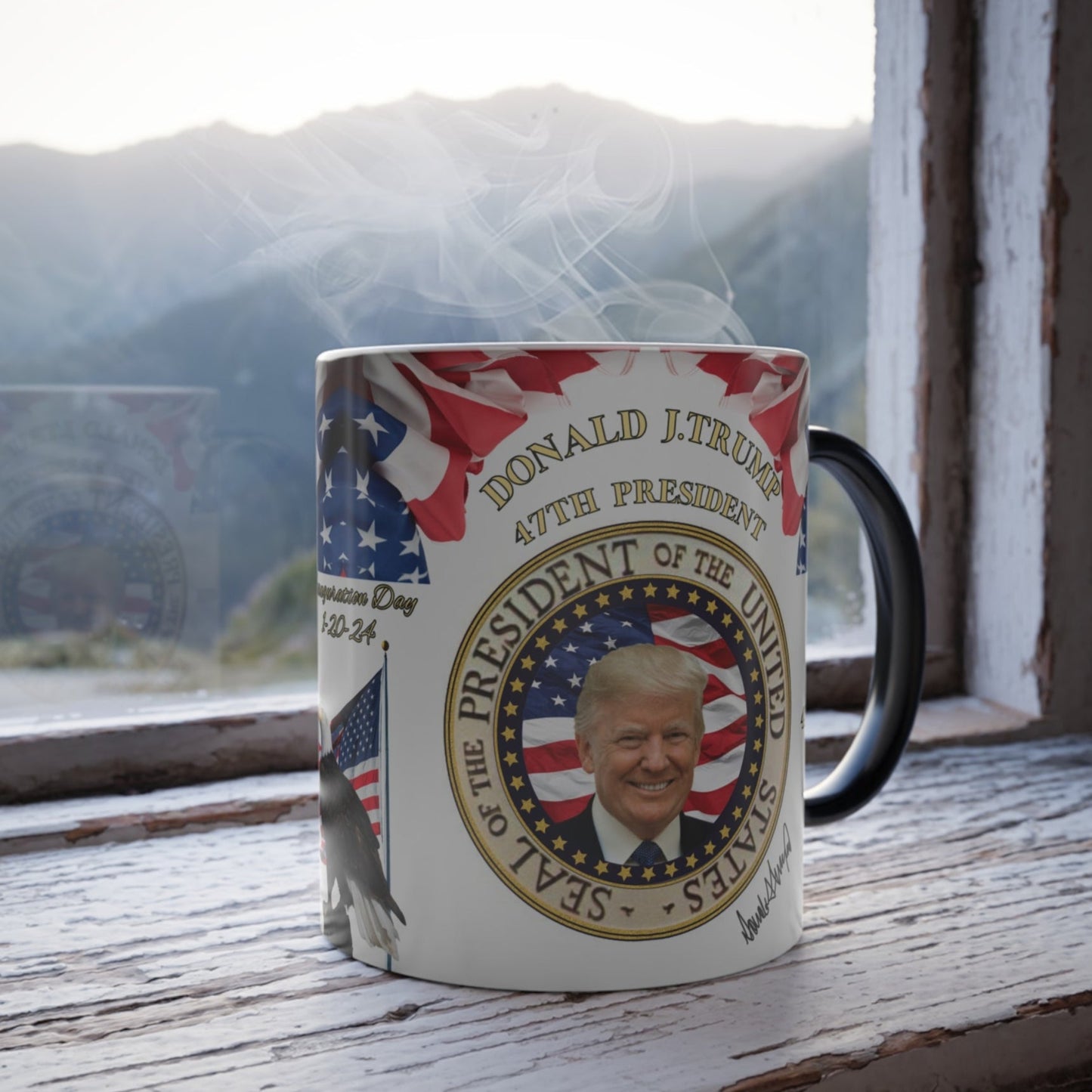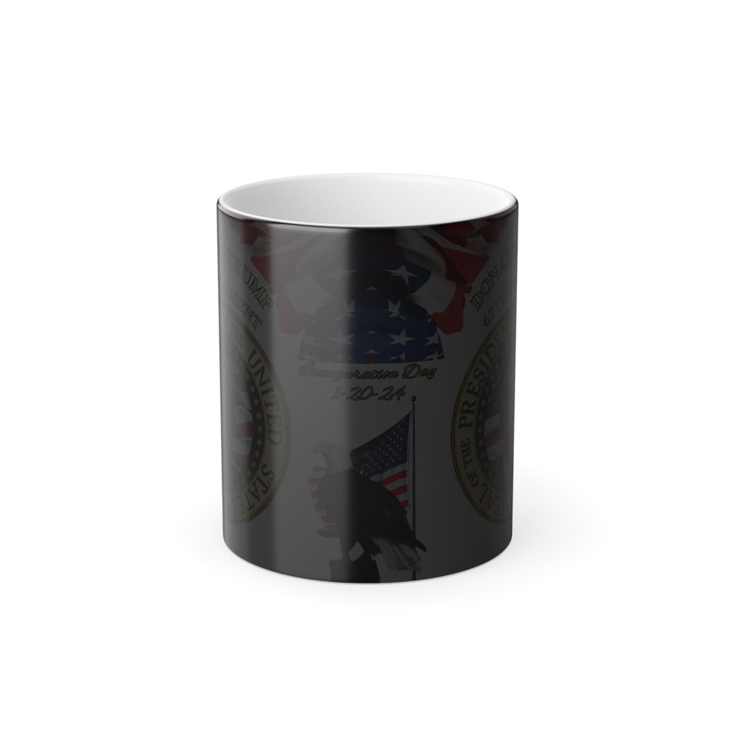 This is a fun and unique Donald Trump mug; it's a morphing mug! Once this Donald Trump Mug gets warm with your favorite drink, the heat-reactive surface reveals the awesome detailed design of Trump's Presidential seal, the American flag, and the beautiful American Bald Eagle watching over.
