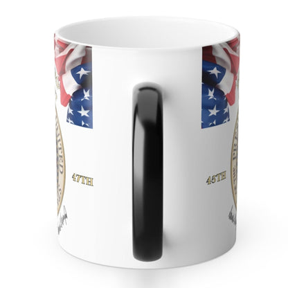 This MAGA mug is perfect for those who support Trump and are patriotic. This Trump coffee mug changes color and will be the gift that keeps on giving. When it cools down, the ceramic cup will return to its original black outside and white inside. The C-shaped handle helps keep a sturdy grip. It comes in one size—11oz (0.33l)—plenty for that big morning cup of coffee.