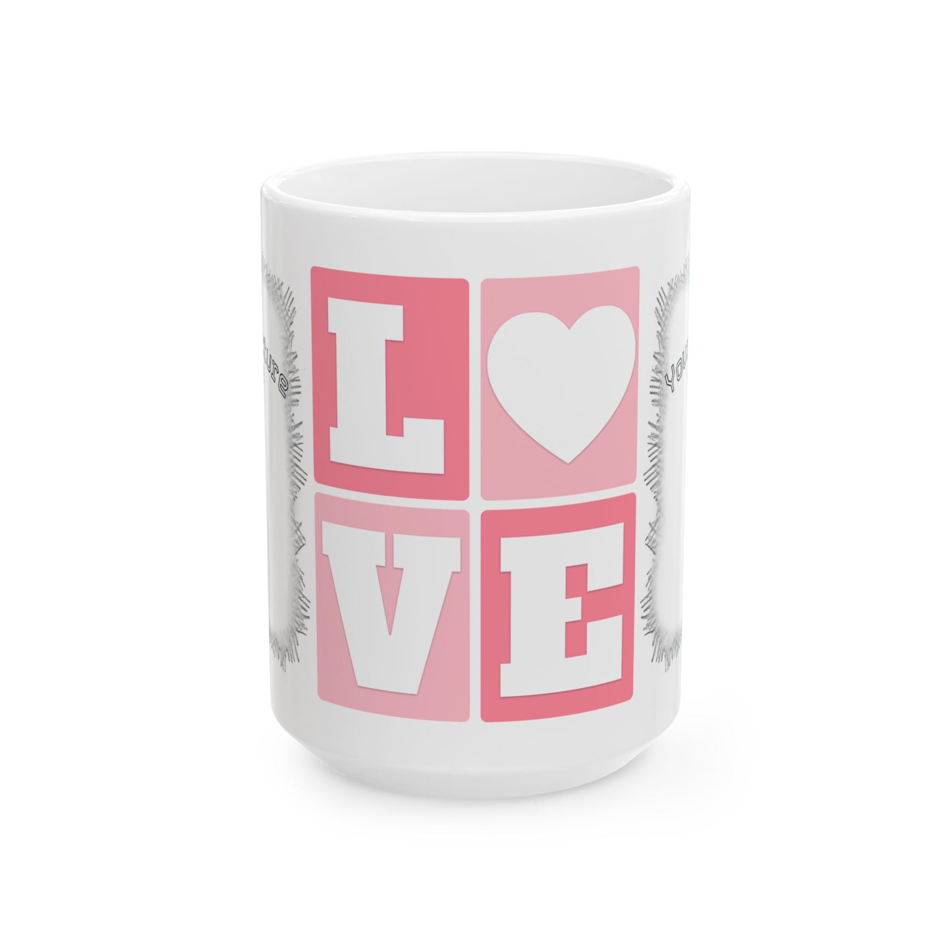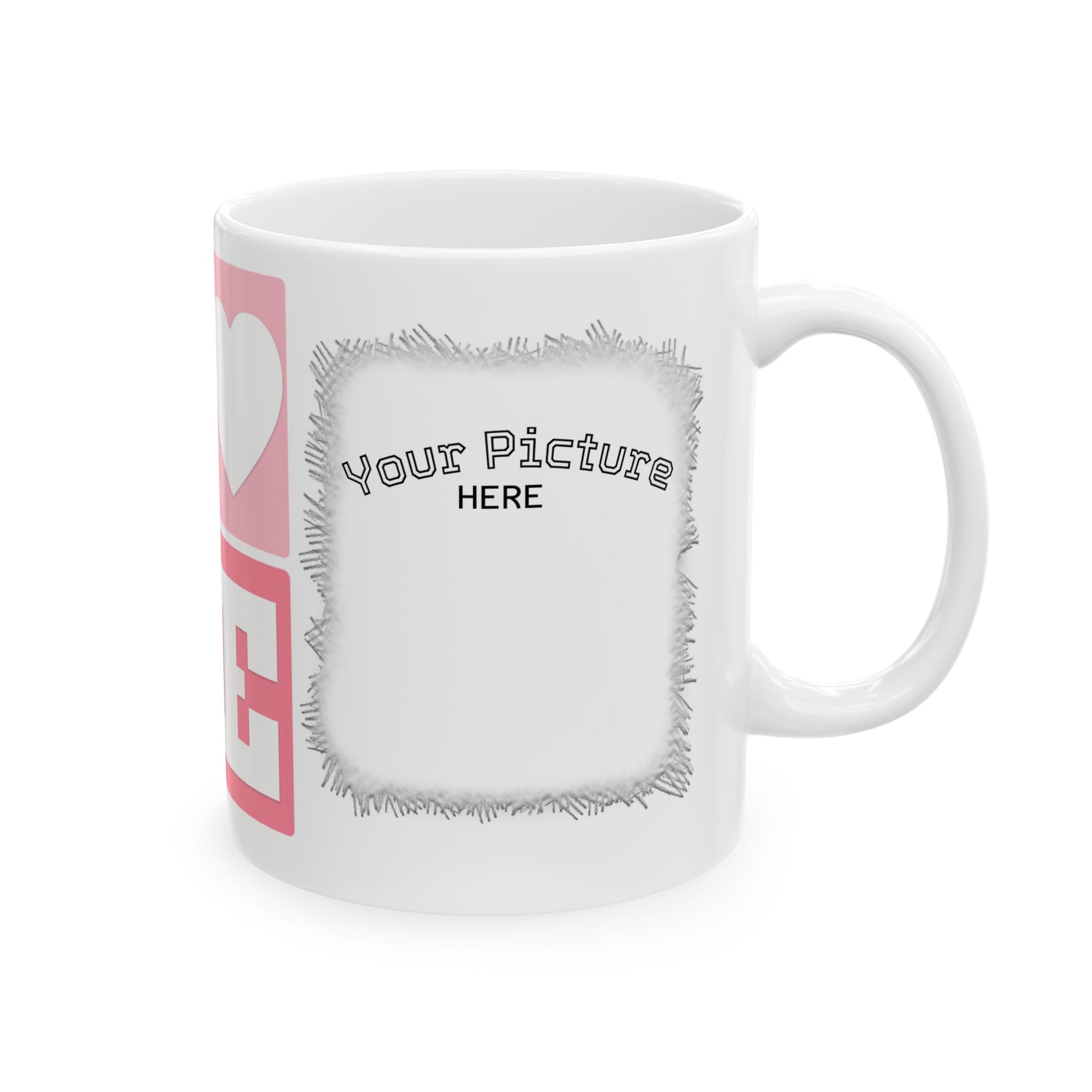 Sip a little warmth and affection every morning with this glossy ceramic mug. Customized this mug with 1 or 2 of your favorite photos, making it a unique and personal mug. Soft pink blocks spell out LOVE with a heart, framed by delicate, hand-drawn wreath accents—an everyday reminder to slow down and savor small moments.