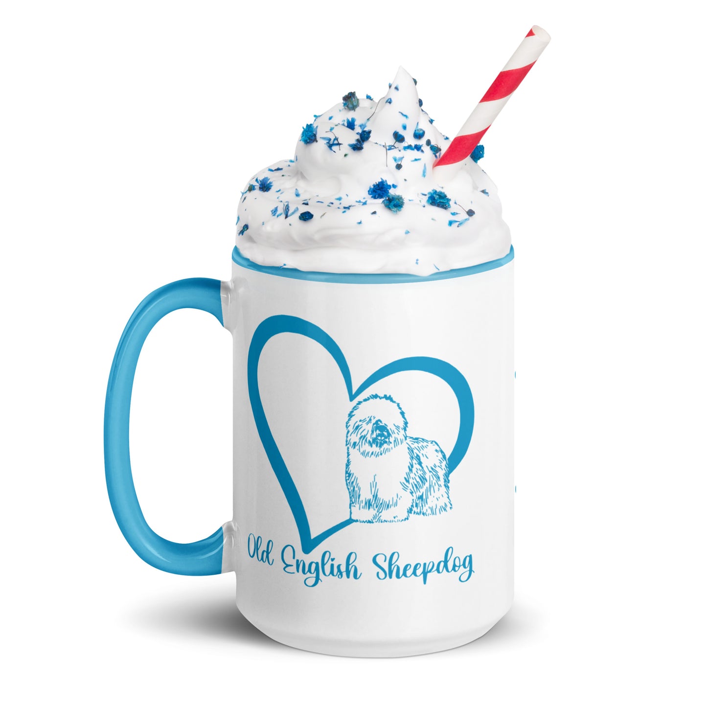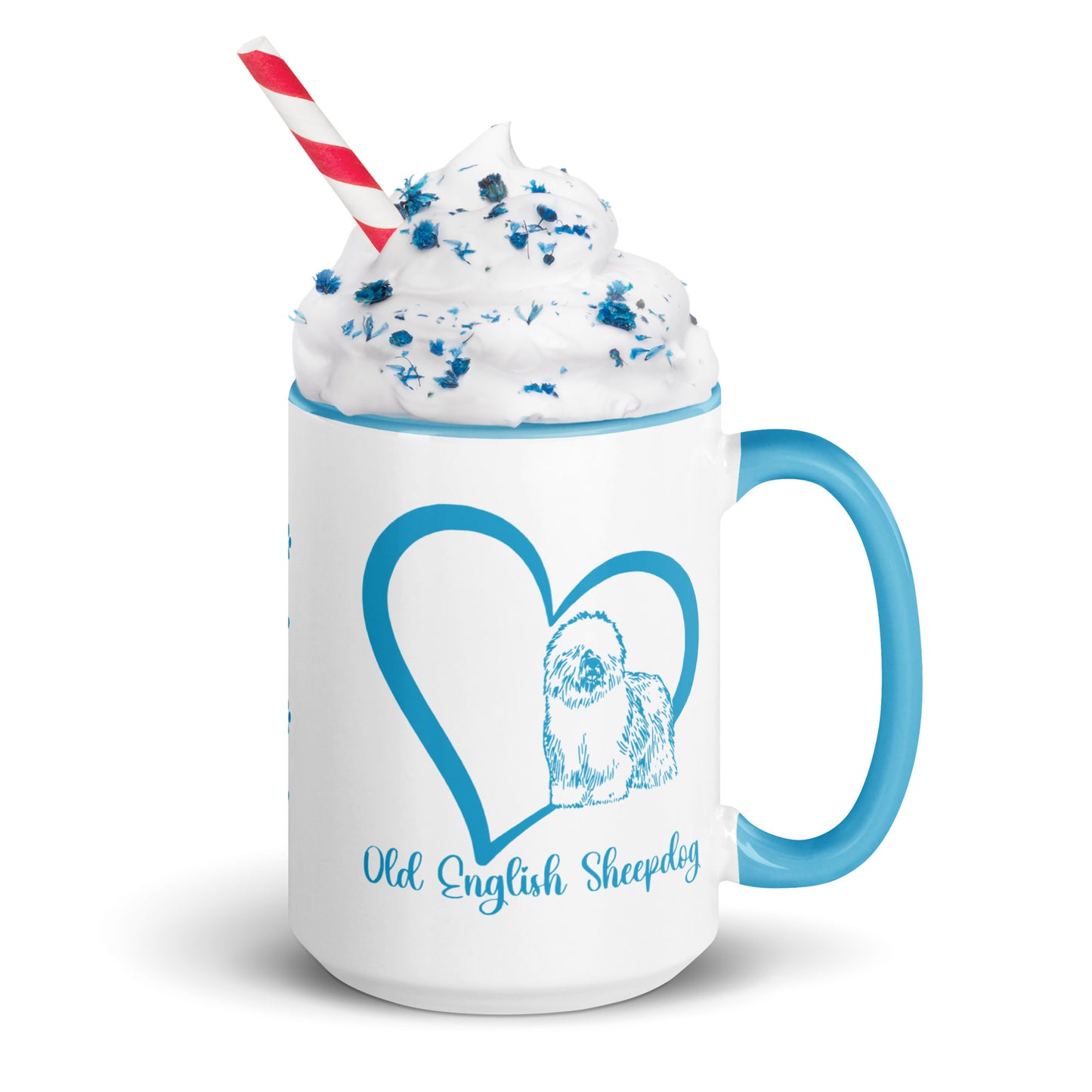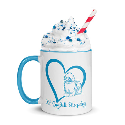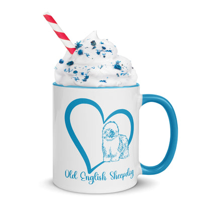 These 2 tone Heart Wrapped Old English Sheepdog ceramic coffee mugs come in 2 sizes, 11 and 15 ounces. This Old English Sheepdog mug not only has a beautiful heart filled design on it, but the rim, handle, and inside coloring match the design perfectly, and it is bound to spice up your mug rack. Perfect coffee mug for OES lover or as a gift for a new Old English Sheepdog owner.