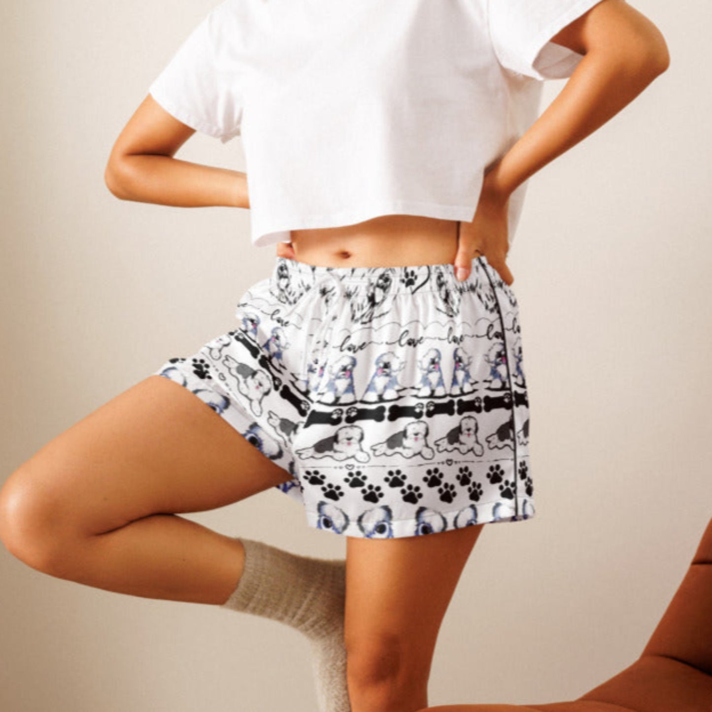 Lounge in luxury with these silky-soft Old English Sheepdog pajama shorts, perfect for lazy mornings or chilled-out evenings. Crafted for women who love comfort and style, these white and black Old English Sheepdog pajama shorts double as chic loungewear with sleek piping details that give them that extra touch of class. Whether you’re Netflixing all day or winding down, these sheepie shorts are a must!