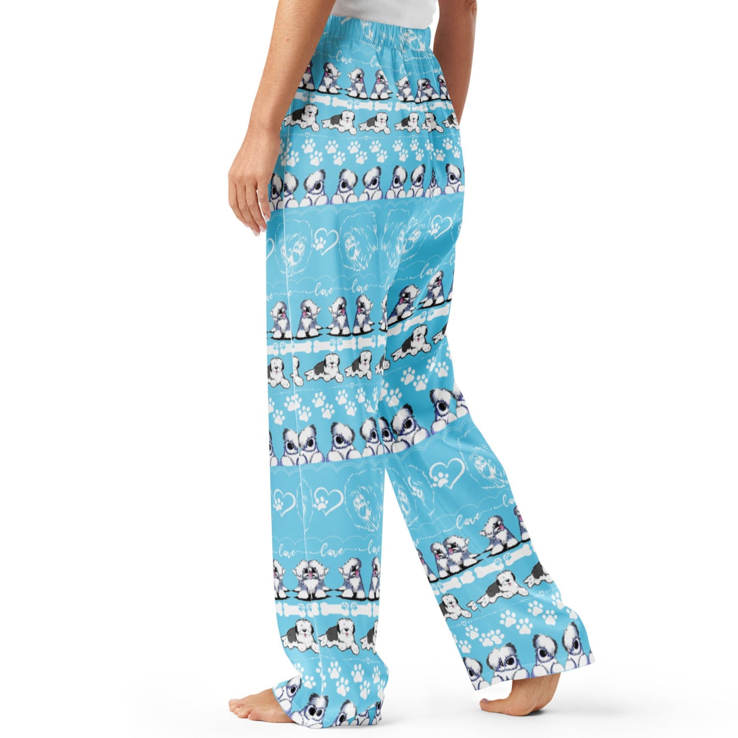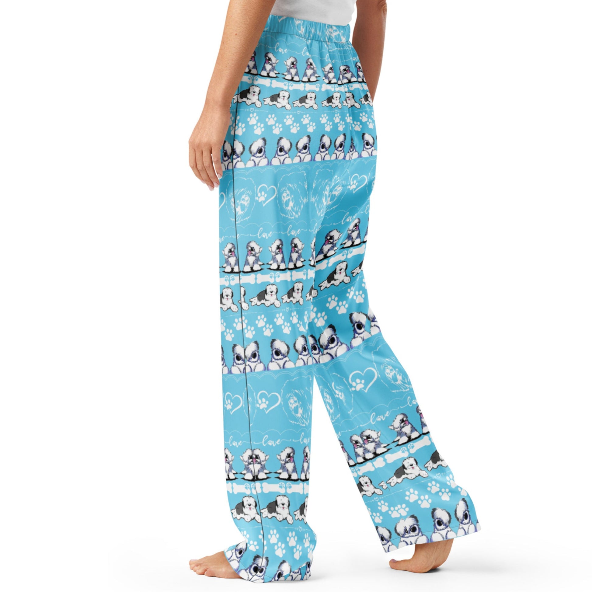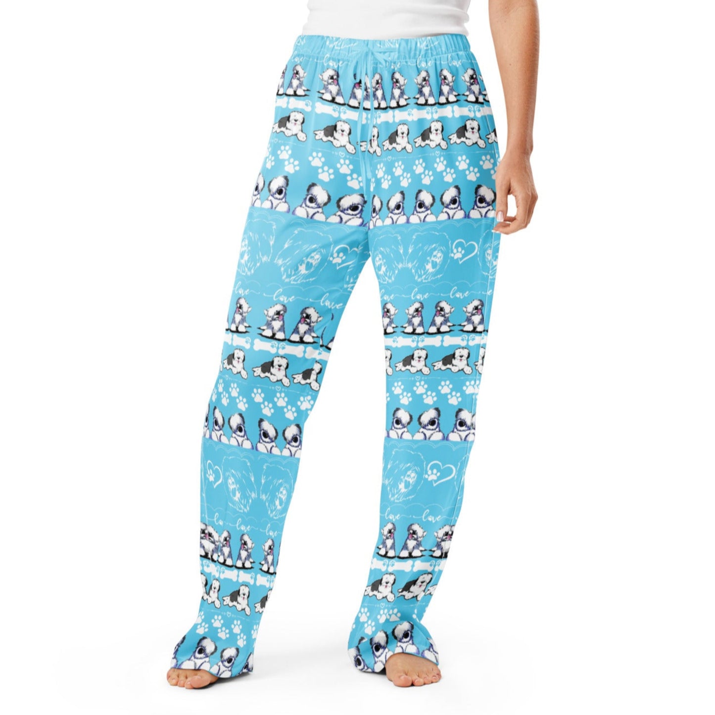 Old English Sheepdog Women's Pajama Pants, Old English Sheepdog Baby Blue Loungewear Pants