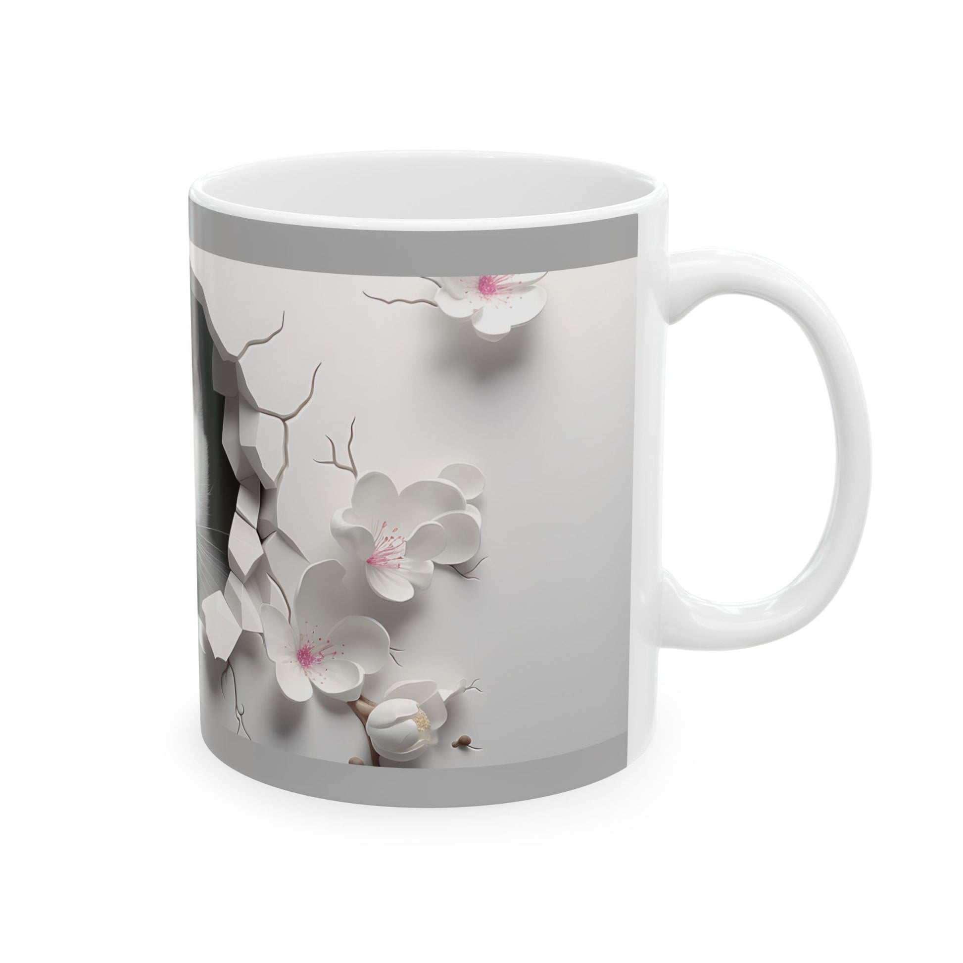 A glossy ceramic mug that brings a soft, whimsical moment to your morning ritual. A curious white kitten peeks through a cracked-paper effect, framed by muted gray and delicate floral accents—small details that feel hand-crafted. The image wraps smoothly around the mug so the kitten greets you with each sip. Lightweight but sturdy, it’s available in two sizes and finished with a comfortable C-handle and shiny glaze that makes the print pop. Microwave- and dishwasher-safe, and free from lead and BPA, it blends everyday practicality with a cozy, heartwarming design that fits gently into quiet mornings, work-from-home breaks, or relaxed evenings with tea.