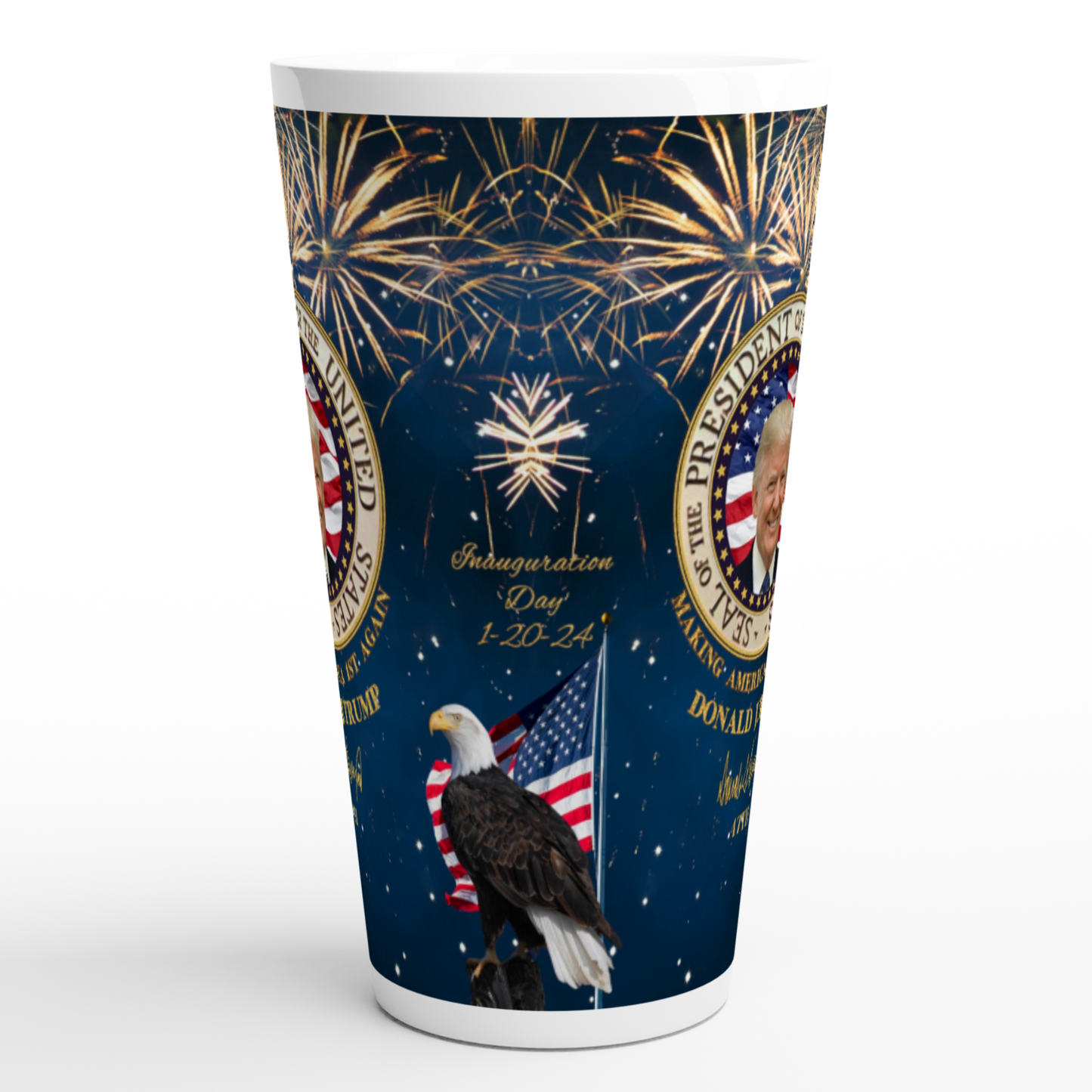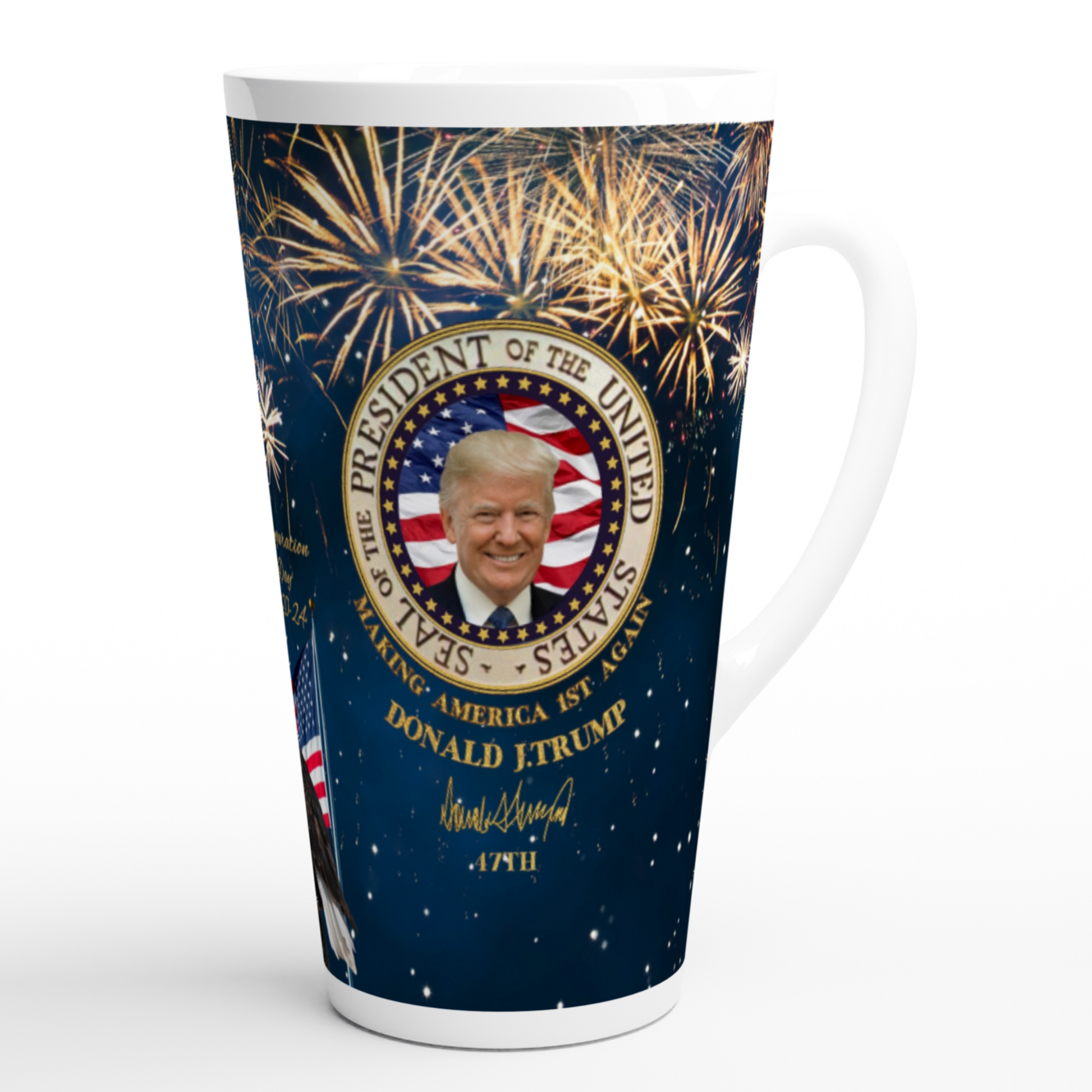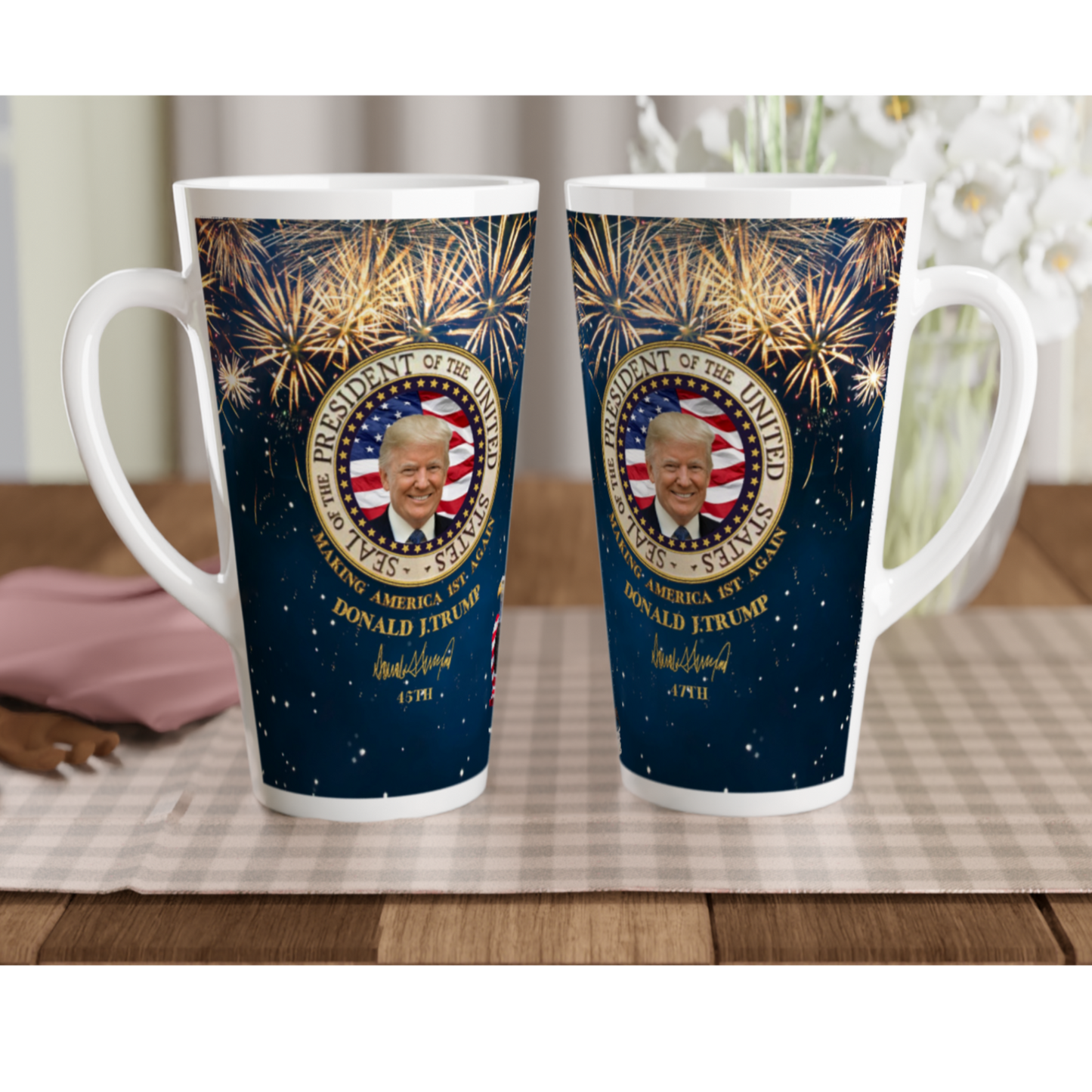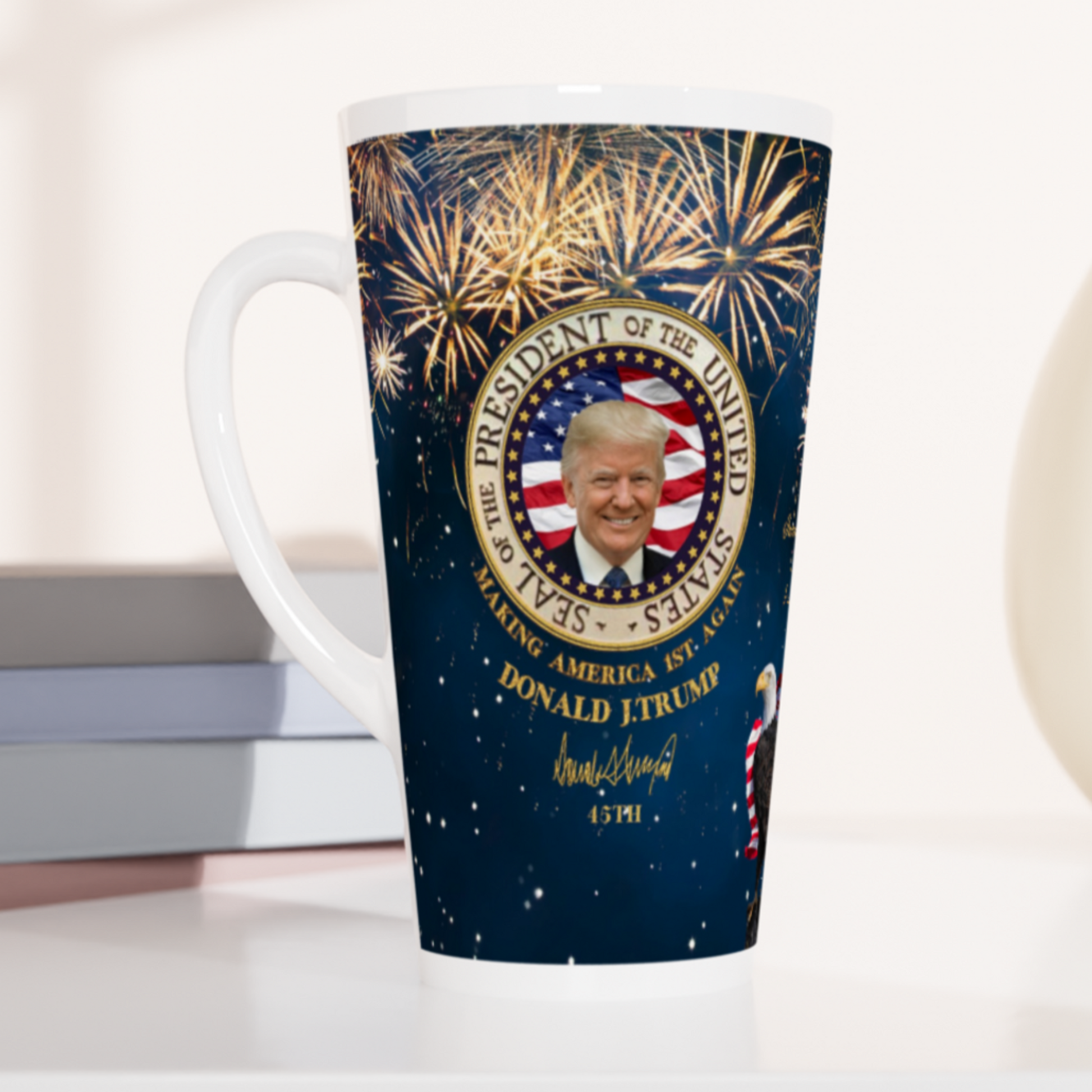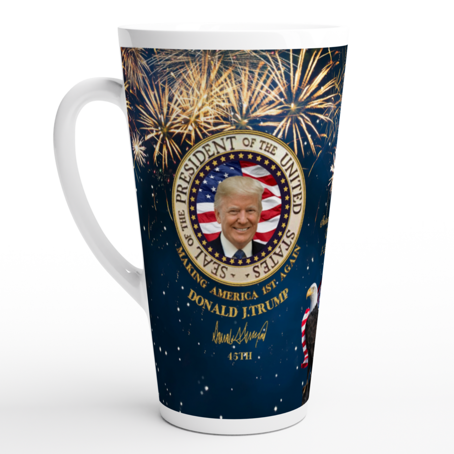 This is a President Trump Latte Coffee Mug that celebrates his win. Get your Donald Trump mug to celebrate the spirit of patriotism he has brought back to America. This beautiful President Trump Mug, has the Presidential Seal, American Flag, Bald Eagle, fireworks, and of course 45 & 47 on it. This Donald Trump Mug is perfect for anyone who supports the MAGA movement, and who proudly supports the message of "Making America 1st Again." This striking mug is more than just a beverage holder; it's a statement piece.