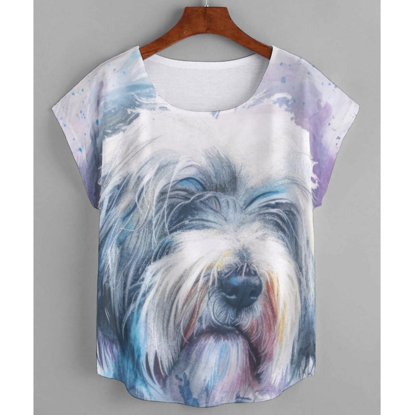 Introducing this stylish plus size Old English Sheepdog Women's shirt, with a beautiful watercolor sheepie graphic. This Old English Sheepdog t-shirt with its classic round neck and curved hem design is perfect for those warm days or for layering during cooler evenings. The vibrant colors and eye-catching design make it a standout choice for any casual outing.